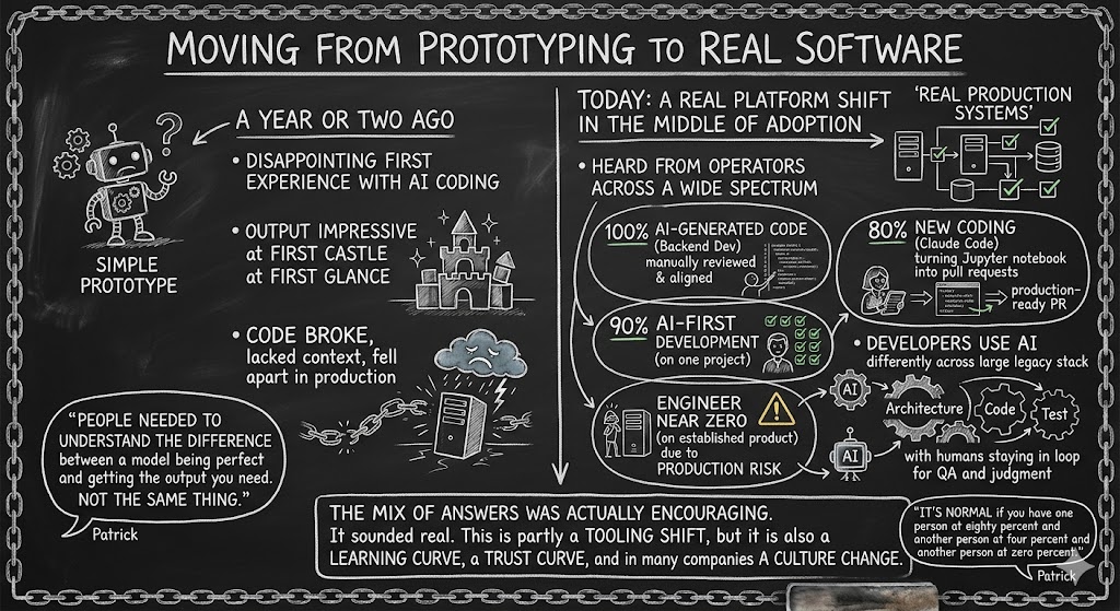 Patrick made another point I thought was important: “It’s normal if you have one person at eighty percent and another person at four percent and another person at zero percent.” A lot of leaders underestimate the human side of this change. This is partly a tooling shift, but it is also a learning curve, a trust curve, and in many companies a culture change.