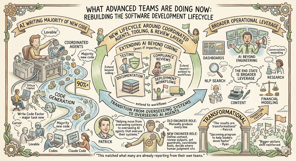 The most mature teams on the call were not just using AI to write code faster. They were beginning to rebuild the software development lifecycle around coordinated agents, tooling, and review layers.