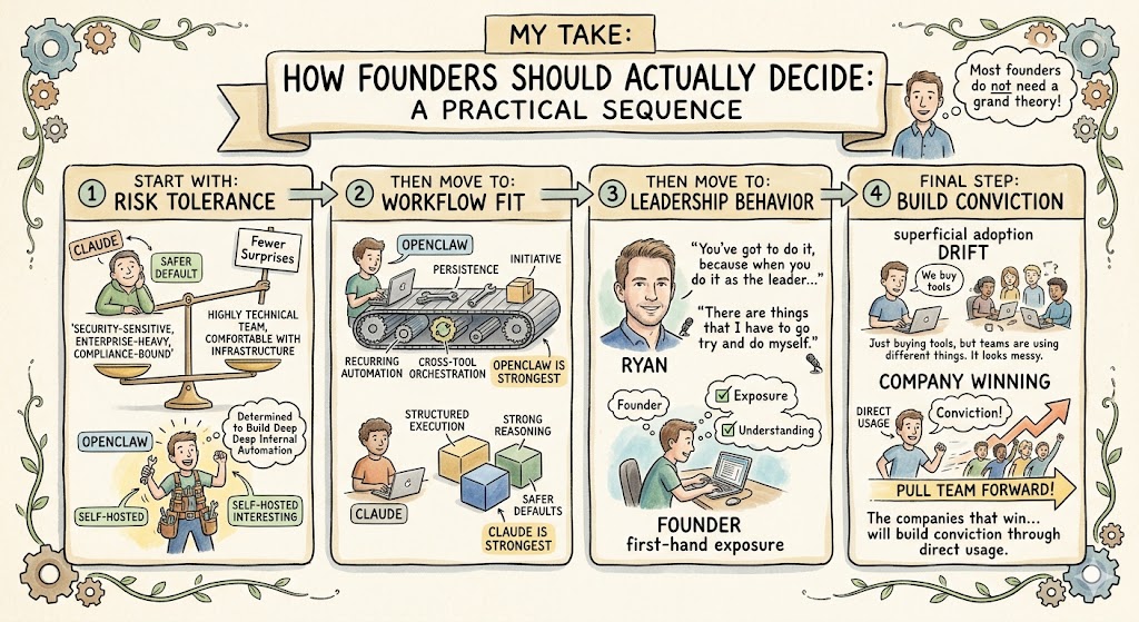 Yes, founders want to know whether OpenClaw is better than Claude Dispatch, Claude Cowork, or Claude Code. That matters. The deployment model matters. The security model matters. The speed of setup matters. But the real issue is not tool selection in isolation. The real issue is whether your company is moving fast enough to redesign its workflows around what these systems can now do. As Ryan put it on the call, “We all have to reinvent our business in the next 12 months if we want to keep going.”
