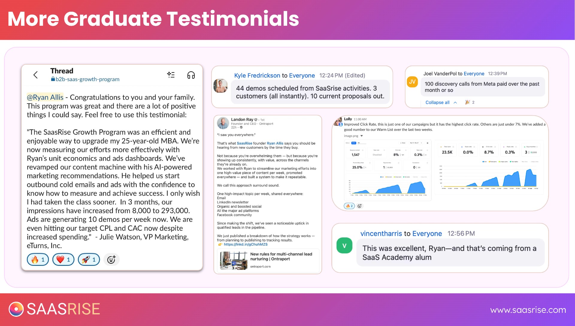 This done-with-you program includes 16 weekly two-hour live Zoom sessions with SaasRise and iContact founder Ryan Allis & digital ads expert David Trachsel (who manages $700k+ per month in B2B SaaS digital ad spend).