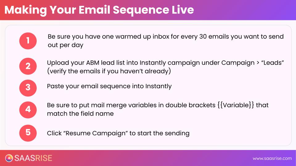 Once your sequence is ready, you’ll load it into Instantly. This is where you’ll: