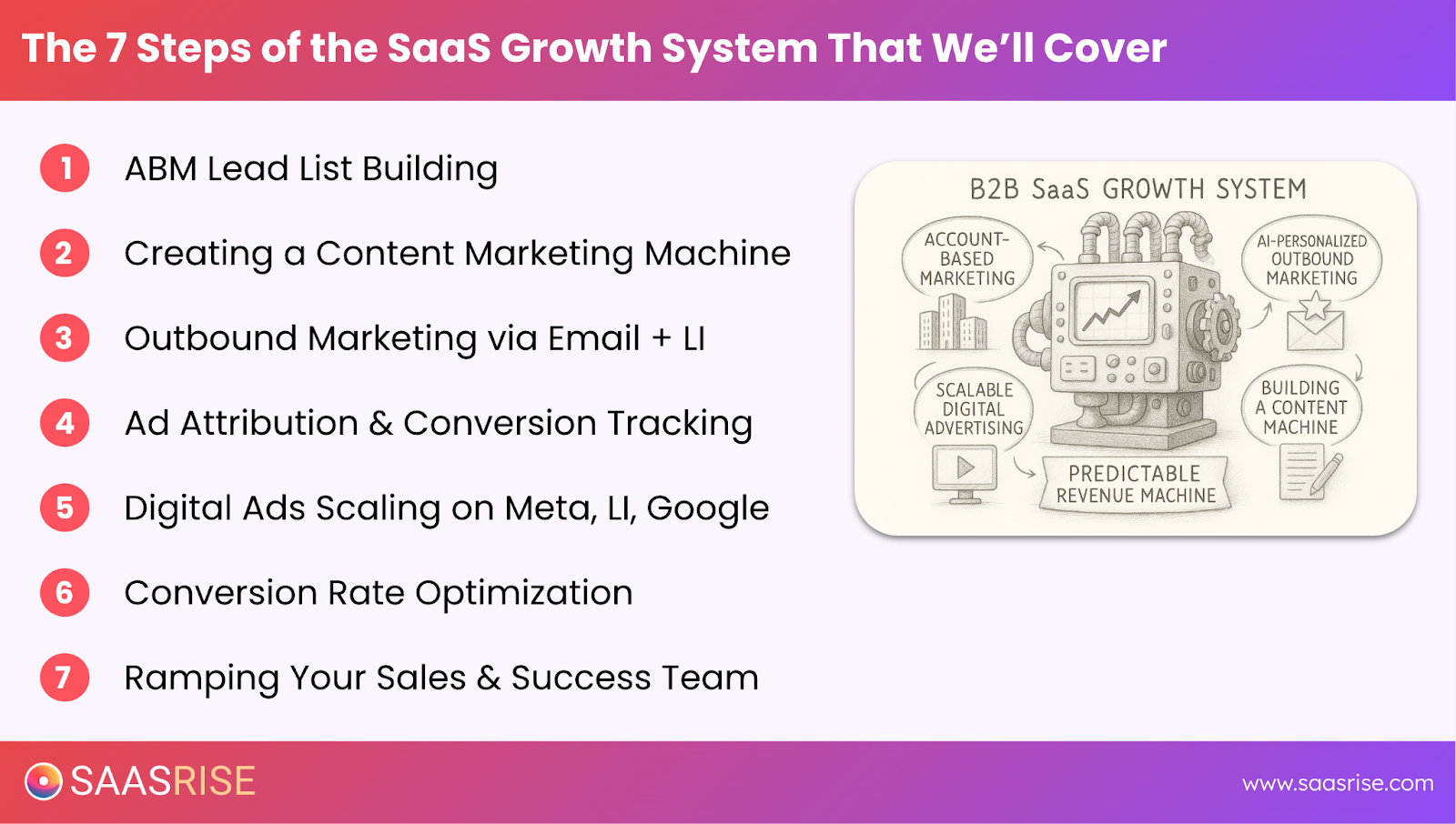 In The B2B SaaS Growth Program webinar, we will break down the 7 steps that align ABM list building, AI-personalized outbound, coordinated digital ads, and structured sales follow-up into one predictable customer acquisition engine — and explain how to implement it inside your company for scalable, measurable growth.