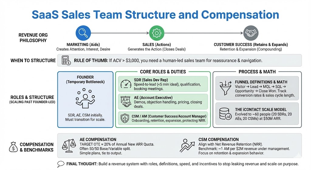 A founder-level guide to building a scalable SaaS sales organization—covering SDR, AE, and CSM roles, quota design, compensation models, funnel math, and how to align sales performance with ARR growth.