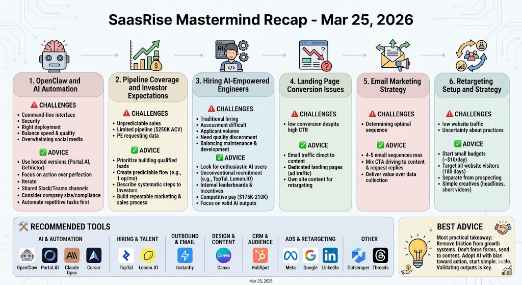 This week in the SaasRise masterminds, we covered everything from AI strategy that actually drives ROI (not hype), to enterprise scaling systems, cold email survival tactics, offshore team management, smart financing, and even how to stay sane while growing fast. It’s basically a founder brain trust — 400+ CEOs, founders, operators, and builders sharing what’s working right now in SaaS, AI, and growth.