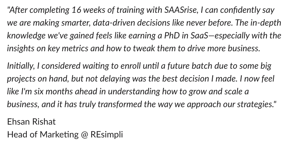 Ryan first of all thank you for the putting together the SaaS Growth Program. This program is worth every penny. On our debrief yesterday with the team I shared that throughout my career usually these sort of programs (consultants etc) have little impact, however this program was top notch and is making an impact.